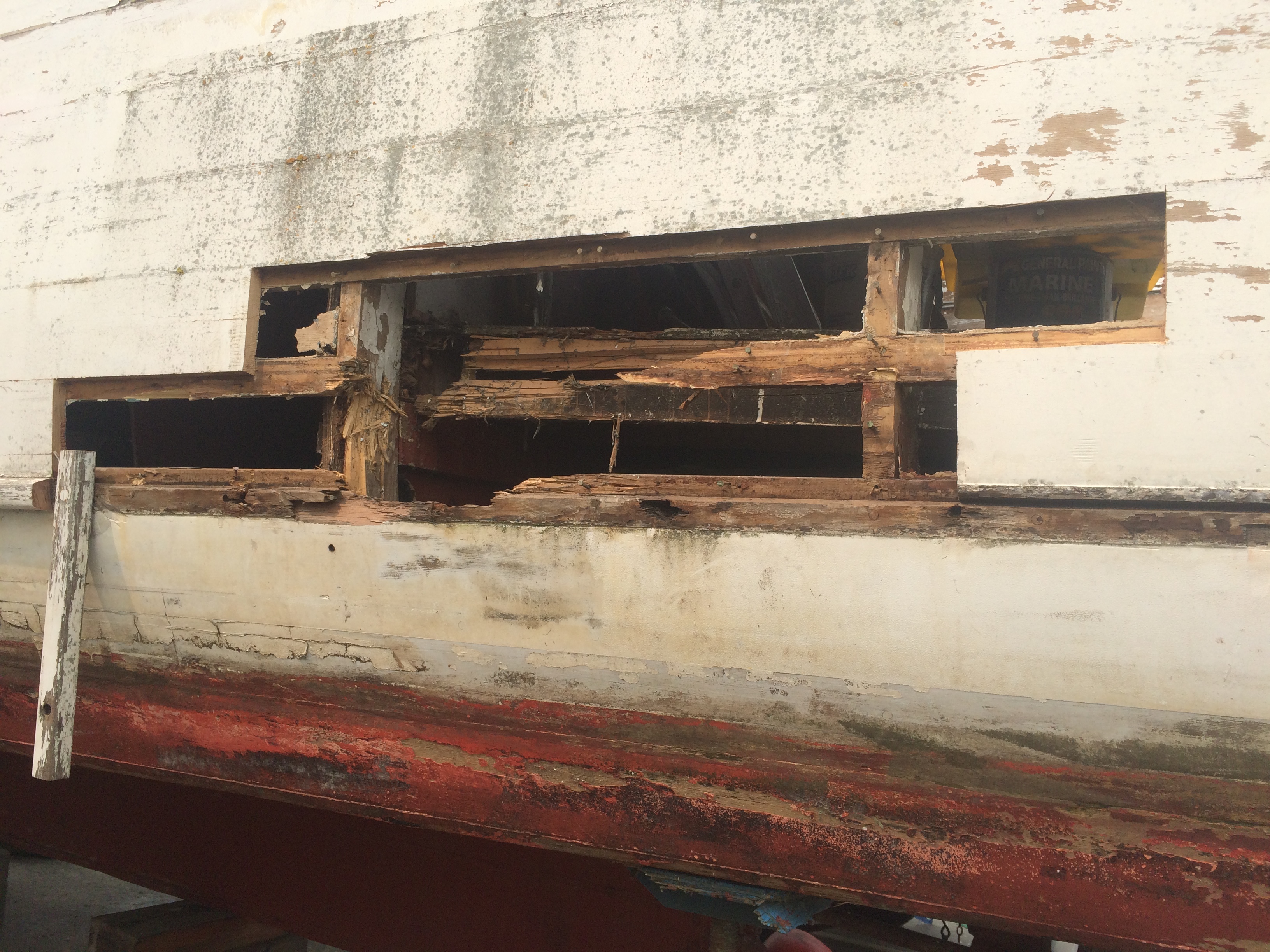 For the next couple of days, we tried to get some work done on the Monk (the new boat). After they pulled it out of the water, we were able to power wash the outside. After that came cutting the planks out where the holes were, so that we could get ready to replace them.