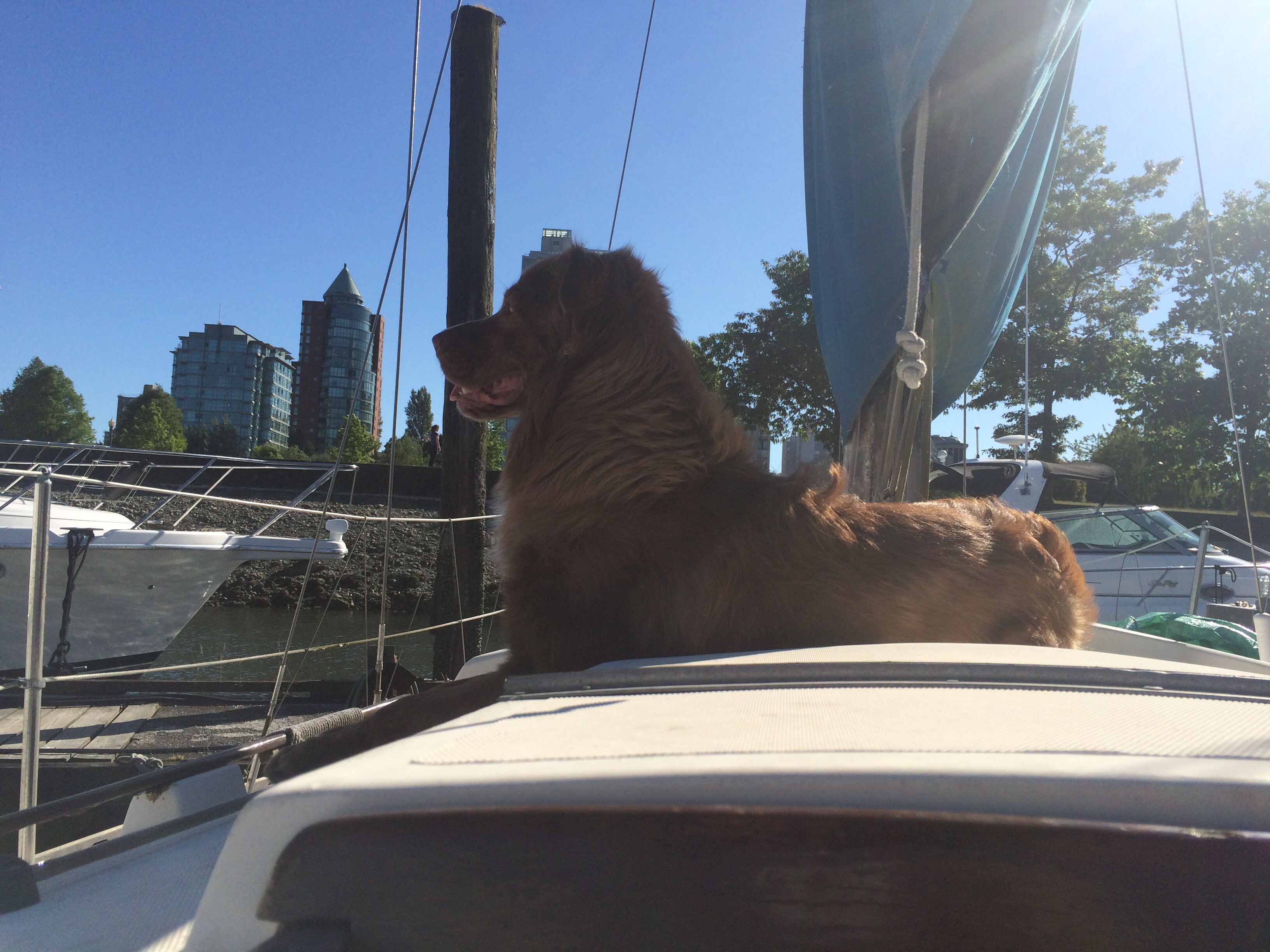 On Saturday, we decided that it was another perfect day to go out sailing. We headed out, and encountered what was probably the biggest water that we have been on thus far. We were comfortable with the size of the waves, but Lenny was not impressed. He spent the entire afternoon giving us reproachful looks from the floor of the cock pit, and couldn’t seem to figure out why on earth we were doing this to him.