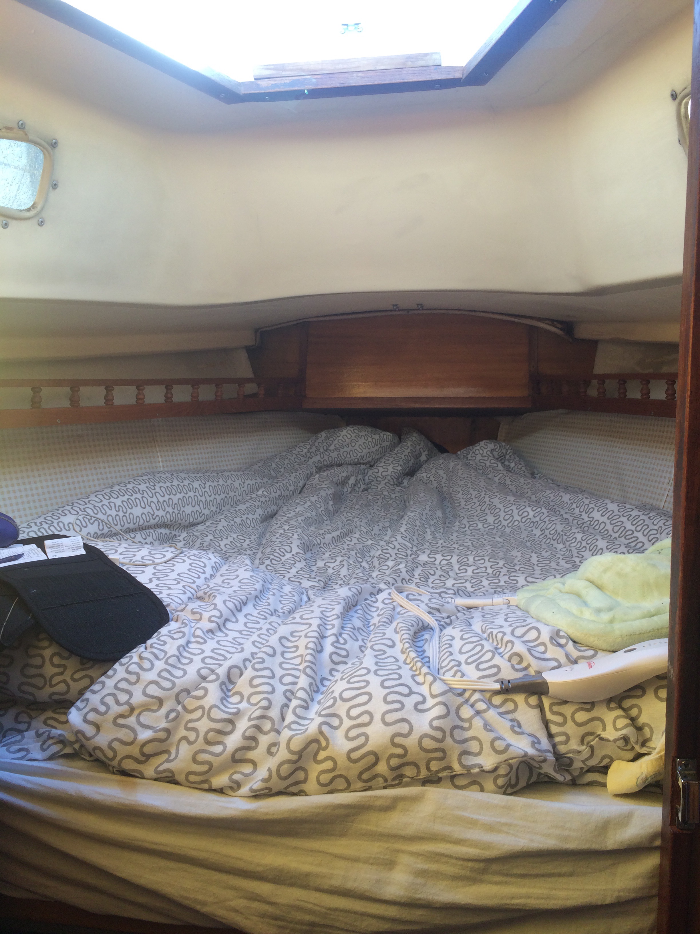 Things were going fairly well, until Alex asked me to go down below and look something up online. Now, I don’t get carsick (a good thing, given our recent ten day road trip), but the moment I try to read in a car I get nauseous. I should have inferred the consequences of reading in rough water, but wasn’t thinking. In no time at all, I was feeling unwell. I went up on deck, but it was too late and ended up getting quite ill. This wouldn’t have been any big deal, even seasoned sailors get seasick from time to time. Of course, for us, it’s never just one thing to deal with. At the exact same moment that I was being sick, Alex misjudged a turn and the wind caught the sail in the wrong way. Suddenly, a piece of our rigging broke, and the boom was swinging freely (not a good situation, and not one that I could stop to take a picture of).